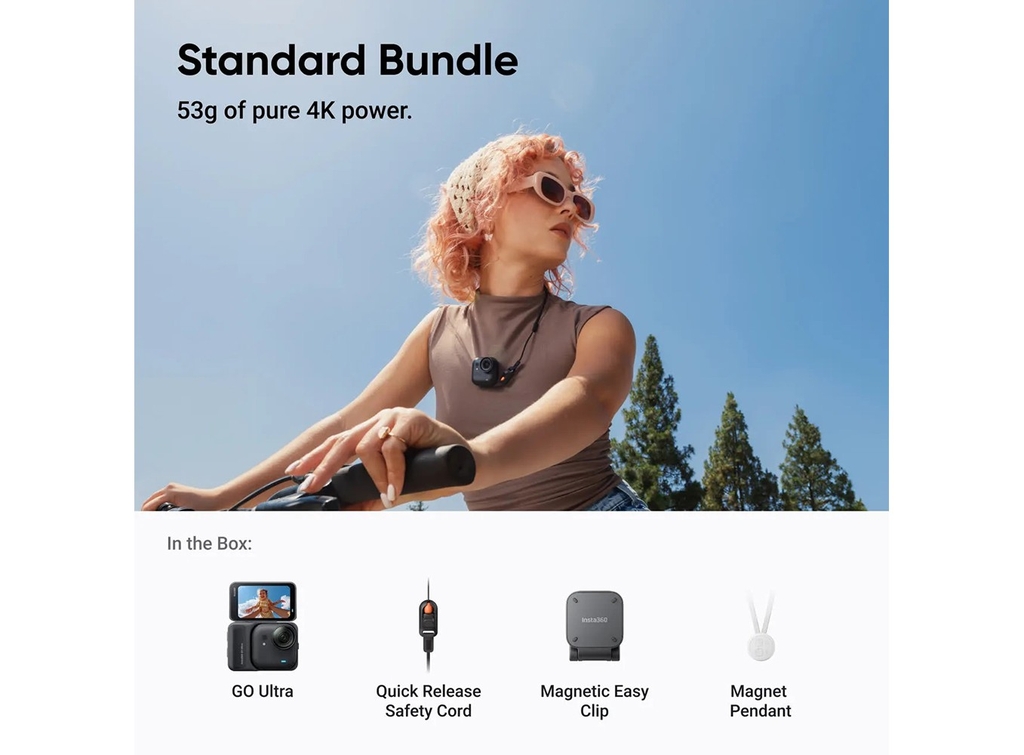 Phiên bản Insta360 GO Ultra tiêu chuẩn bao gồm một mặt dây chuyền nam châm, kẹp nam châm dễ dàng và dây an toàn tháo lắp nhanh chóng để bạn yên tâm lắp đặt.